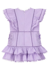 - Flutter sleeves with pom-pom trim
