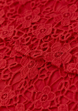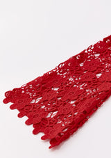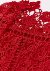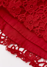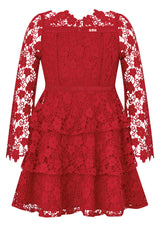 A timeless Marlo favourite returns in festive red - the Cora Embroidered Mini Dress. Crafted from intricate embroidered lace, this show-stopping silhouette features long sleeves and a tiered frill skirt, perfect for holiday celebrations and special occasions.