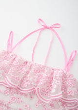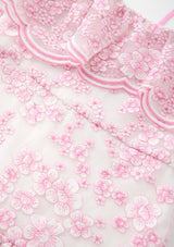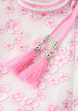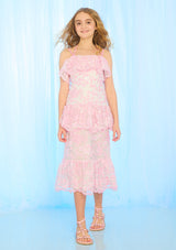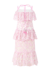 The Elize Embroidered Midi Dress is a romantic, occasion-ready piece featuring delicate pink floral embroidery and layered ruffle detailing. With its soft off-the-shoulder neckline, adjustable straps, and tiered silhouette, this dress brings effortless elegance to garden parties, weddings, and special celebrations.