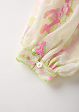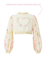 The Antoinette Top features charming bishop sleeves and floral embroidery, perfect for pairing with jeans or the matching Antoinette Skirt. Its detailed design adds a touch of elegance to any outfit.