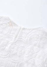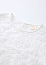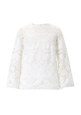 The Estelle Lace Top is an elegant ivory lace top with long flared sleeves, perfect for pairing with jeans or the matching Estelle Lace Pants for a coordinated look. It's ideal for adding a touch of sophistication.