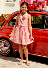 Make merry in the Jingle Dress! Available in two cheerful color options, blue and pink, this dress features a sweet A-line silhouette, halter neckline with a tailored collar and playful details. Perfect for holiday celebrations, this dress brings a fun and festive feel to the season.