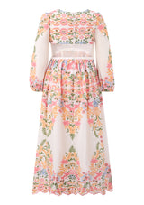The Lyla Embroidered Maxi Dress features Marlo exclusive embroidery, long balloon sleeves, an open back, and tie-up front details. This dress is perfect for creating a stylish and unique look.