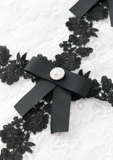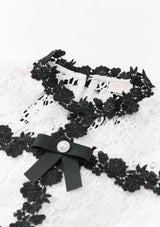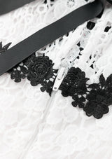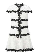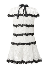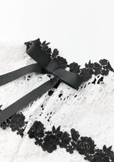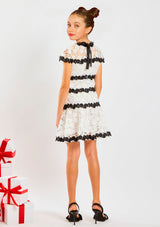 Chic and timeless, the Aveline Embroidered Mini Dress combines delicate lace florals with a striking monochrome palette. Finished with pearl-embellished bows and intricate detailing, this piece brings a touch of sophistication to every festive occasion.