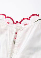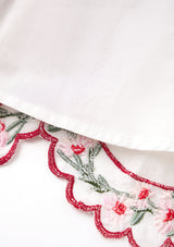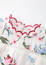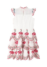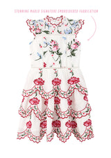 The Maisie Embroidered Frill Dress is a mini dress with an embroidered floral print and short flutter sleeves. This dress offers a charming and playful look, perfect for any event.